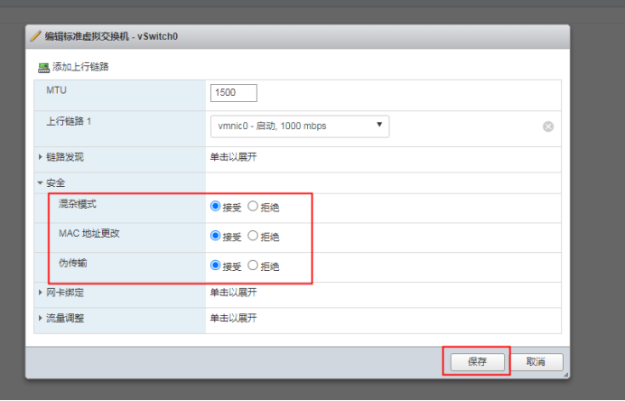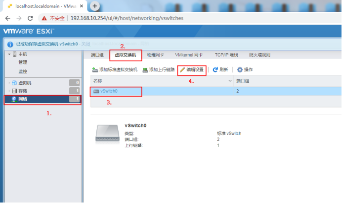 点击:网络—虚拟交换机—点击VSwitch0—编辑设置