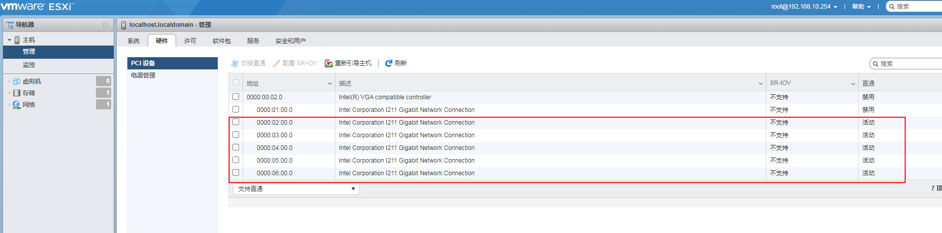 老版本的esxi软路由重启后再次登录查看网卡直通是否已经活动.