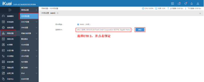 ②.给wan1绑定eth2网卡 (根据自己的实际情况,主要看你光猫的那条线插在那个网口上,wan口是外网互联网口)