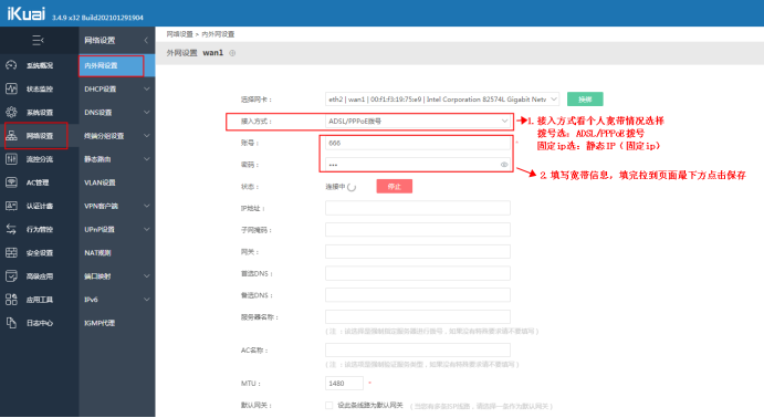 ③.接入方式依据自身宽带而选,填完宽带信息点击保存