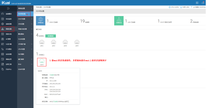 是否变成绿色,并把鼠标放在wan1上面查看是否有ip等信息,有则是设置wan1成功,没有则请检查填的宽带信息是否正确或者接入方式是否选对