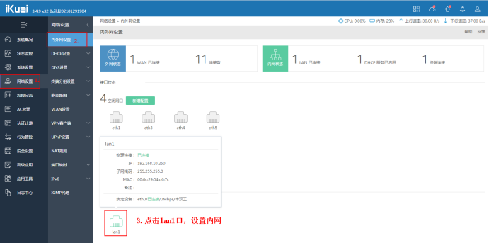 3.设置内网口(lan1口即接电脑、交换机和自己无线路由器等)
