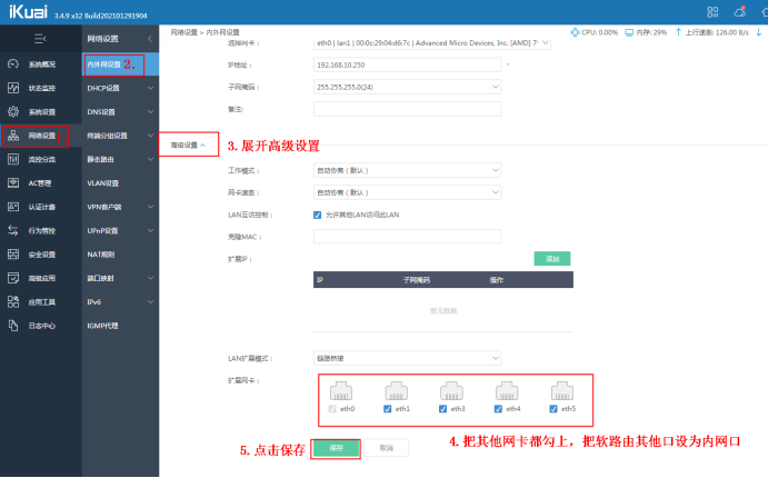 注意:esxi里面的网卡虚拟直通后,网卡顺序是错乱的,例如eth2对应的是软路由的ETH5