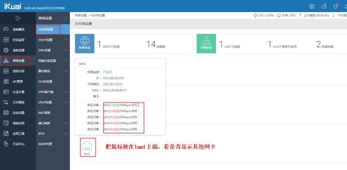 ③.将鼠标放在lan1上面看是否显示其他网卡