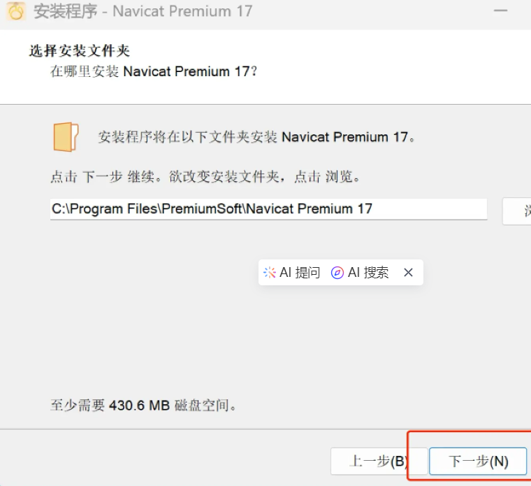 4.选择Navicat 17安装路径(推荐 D 盘,如 “D:\soft\Navicat17”,参考软件安装路径设置建议)