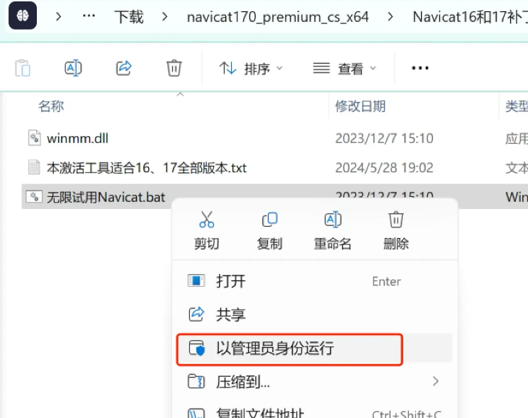 1.进入“Navicat17 ”下载试用的文件夹(右键 “管理员身份运行”)。